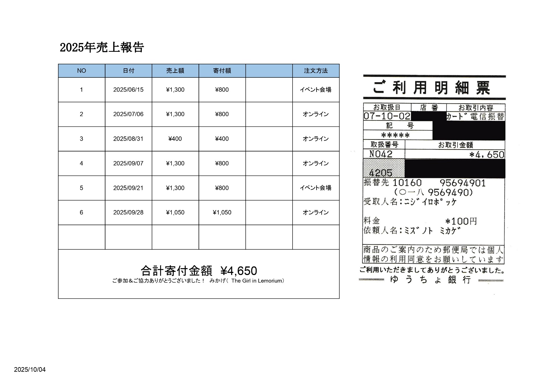 売上額と寄付額: 総売上額は7,400円、そのうちシステム手数料を差し引いた6,660円を寄付